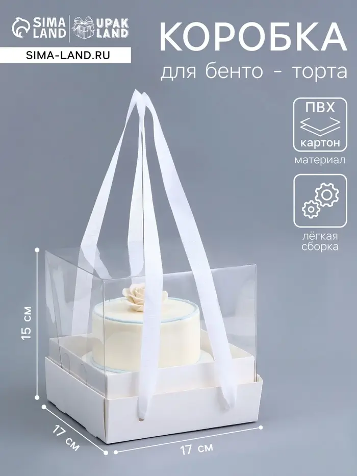 - Квадратный формат 17×17×15 см для небольших тортов и десертов: Габариты подходят для упаковки бенто-тортов, муссовых десертов, чизкейков и порционных пирожных на подложке. Высота 15 сантиметров оставляет запас для мастичных фигурок, шоколадного декора и ягодных композиций. Коробка вмещает стандартный десерт для небольшой компании.