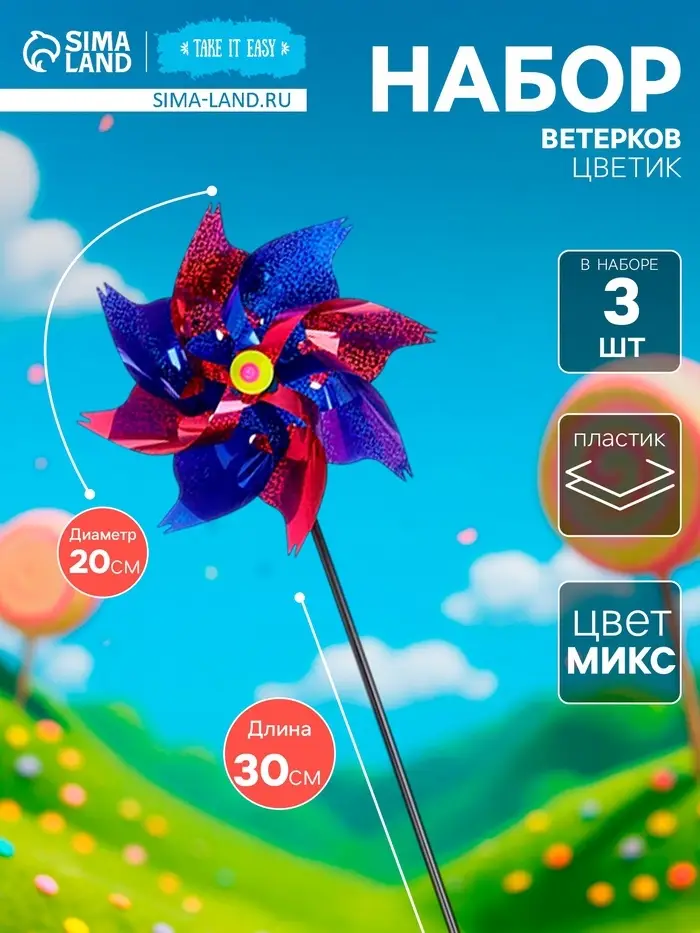 - В наборе 3 разноцветных ветерка — можно расставить по всему участку или разделить между детьми для весёлых игр.