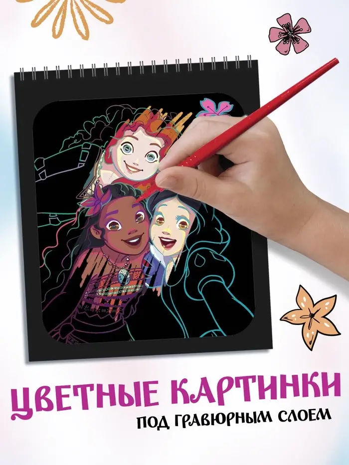 - Творческий процесс с гравюрами развивает мелкую моторику, аккуратность и воображение. Разноцветное основание добавляет яркости готовым работам, а наличие героев из Disney делает занятия особенно захватывающими.