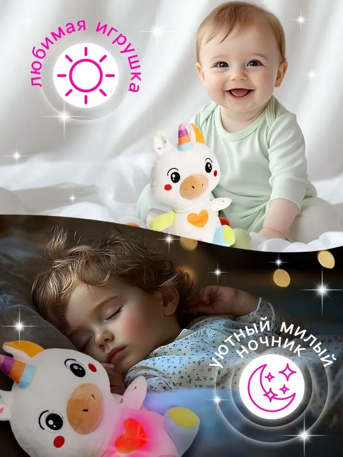 Музыкальная игрушка для сна «Единорог» станет верным помощником для малышей и их родителей в момент засыпания. Мягкий и уютный друг сочетает в себе звуковые и световые эффекты, создавая спокойную атмосферу для лёгкого и крепкого сна.