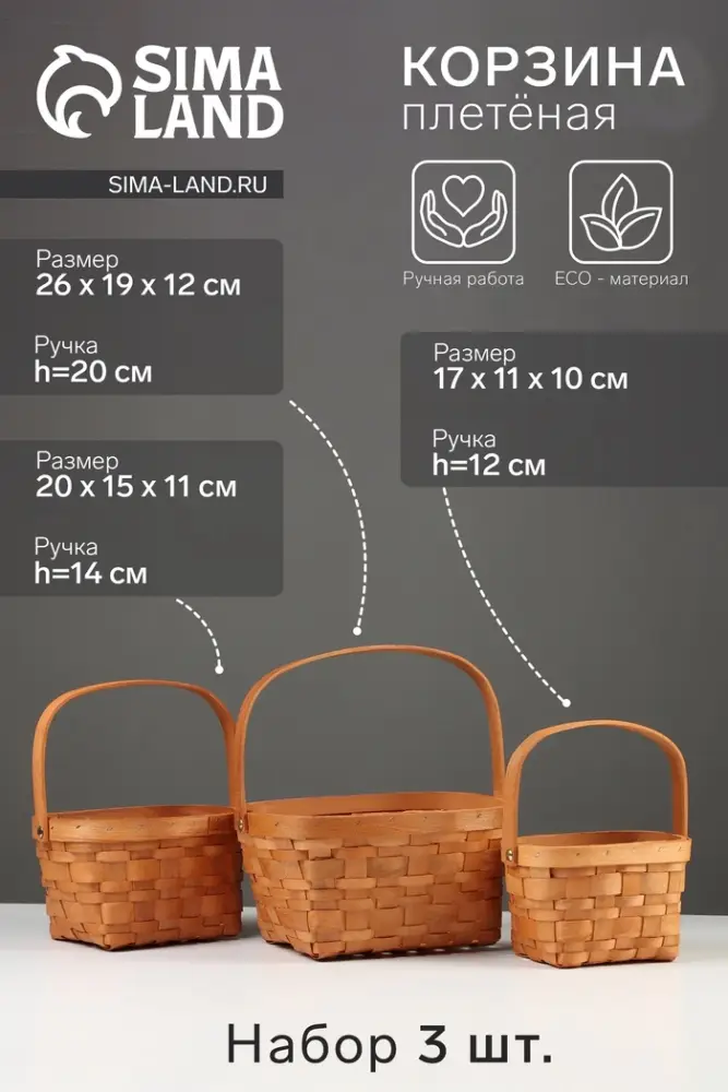 Набор корзин плетёных, 3 шт., 26×19×12 см, 20×15×11 см, 17×11×10 см, ива, натуральный цвет