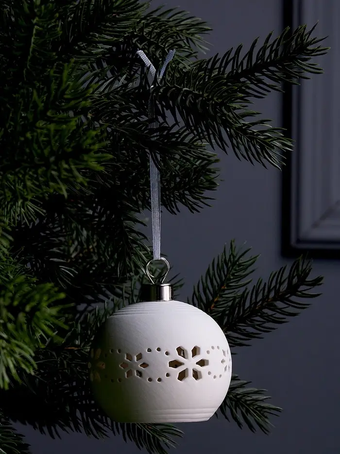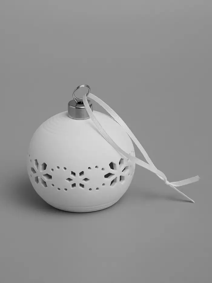 Декоративный шар с изящными орнаментами объединяет классическую эстетику и мягкое световое оформление, создавая выразительный акцент в праздничном интерьере. Керамическая поверхность подчёркивает аккуратность деталей, а тёплое свечение добавляет глубины и уюта новогоднему декору.
