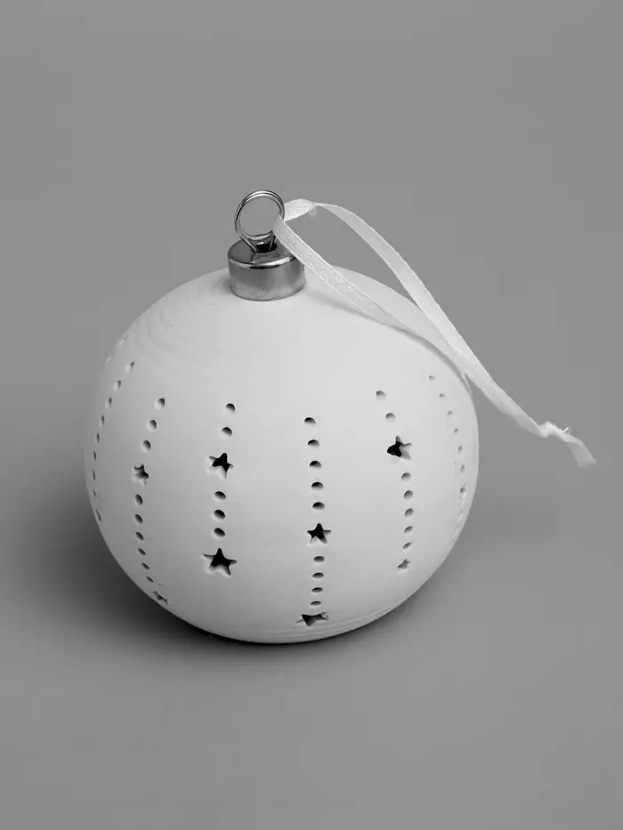 Ёлочный шар с декоративным узором в виде звёзд и мягкой подсветкой создаёт спокойное и атмосферное освещение в праздничном интерьере. Тёплый белый свет проходит через керамический корпус, подчёркивая рисунок и формируя аккуратное рассеянное свечение.