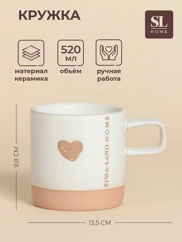 Кружка SL Home «Сердце», 520 мл, 13.5×9.6×9.8 см, керамика, белая