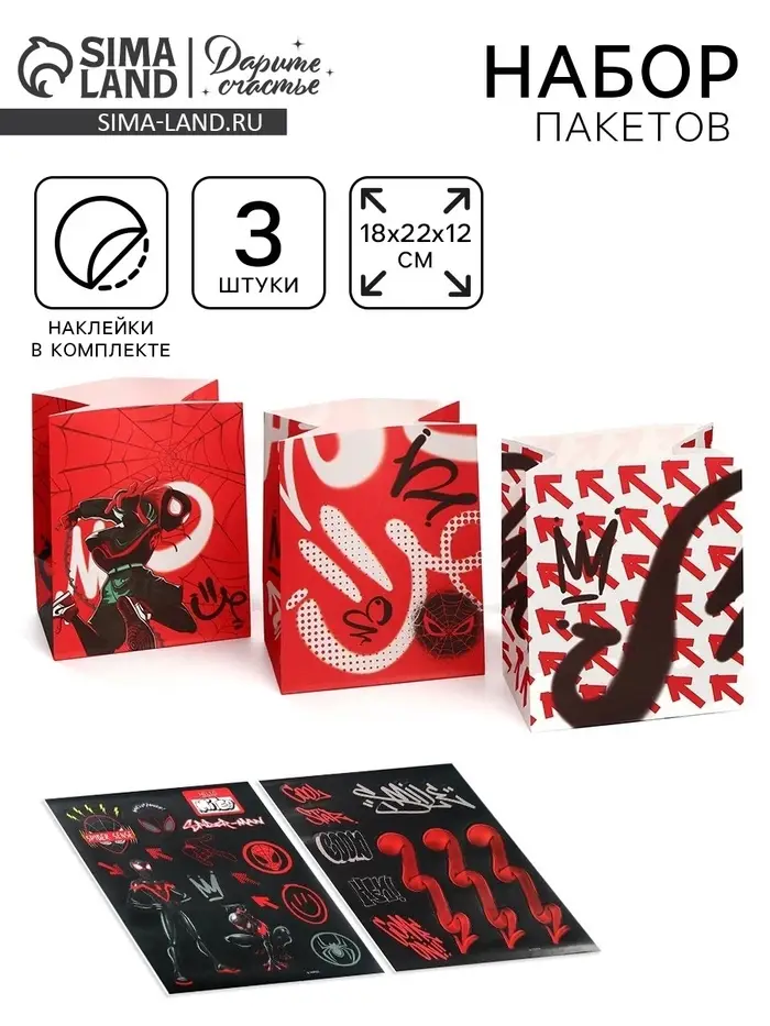 Пакет подарочный крафтовый со стикерами,, набор 3 шт., 18×22×12 см, «Супергерой»