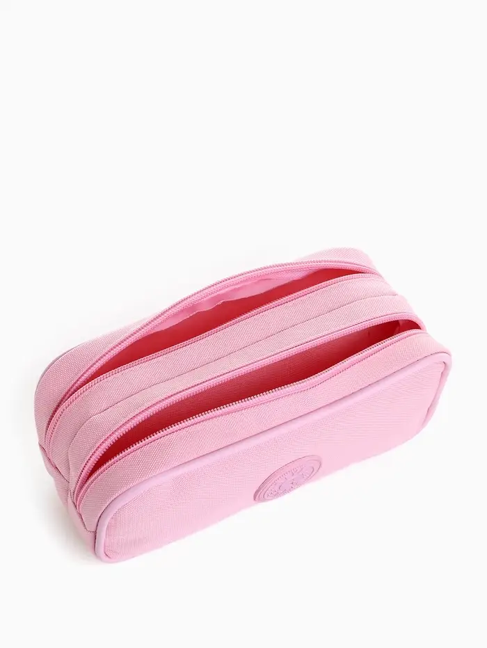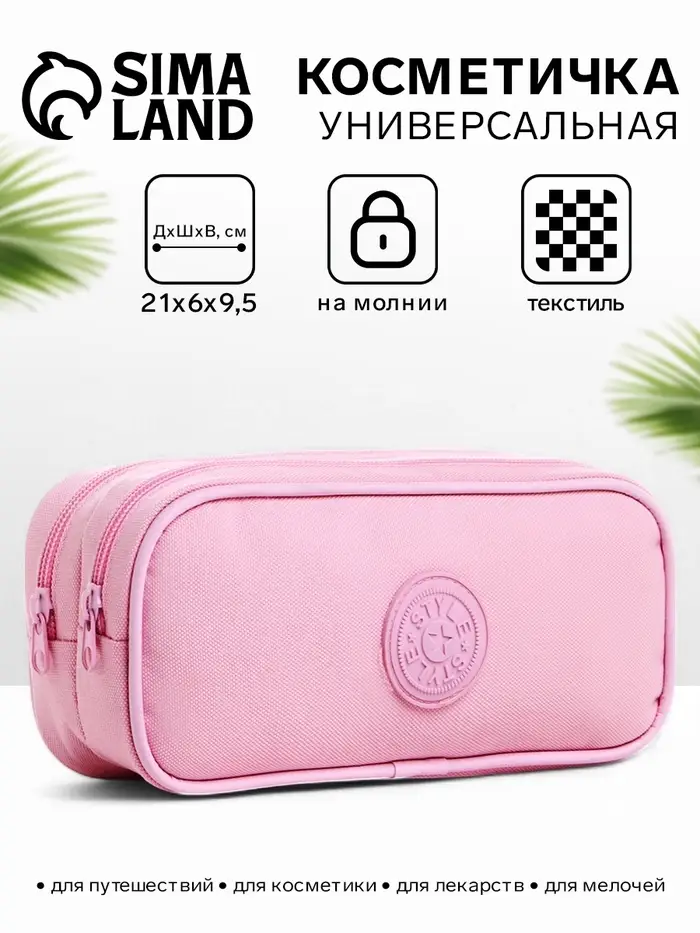 Эта розовая косметичка — ваш надёжный спутник для ежедневного макияжа и хранения самых нужных мелочей. Два отделения на молнии помогают быстро найти кисти, помады или карандаши и держать их в порядке. Мягкий текстильный материал приятен на ощупь, а компактный средний размер легко помещается в сумку или рюкзак, не занимая много места.