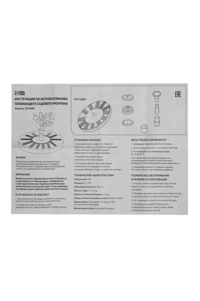 Фонтан садовый JT-130F1, 7 Вт, h=55 см, 150 л/ч, на солнечной батарее