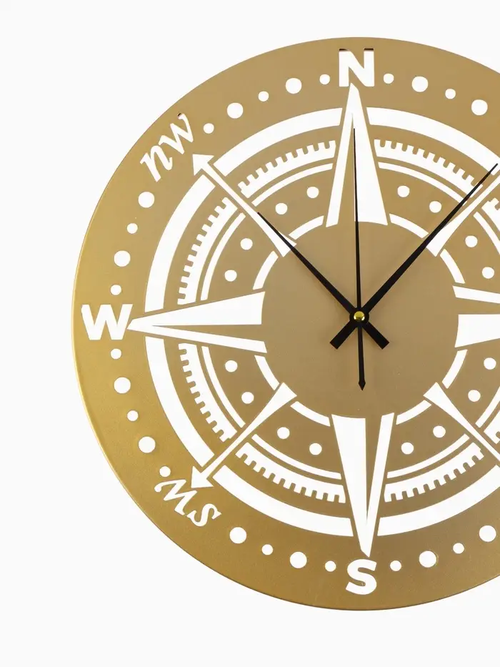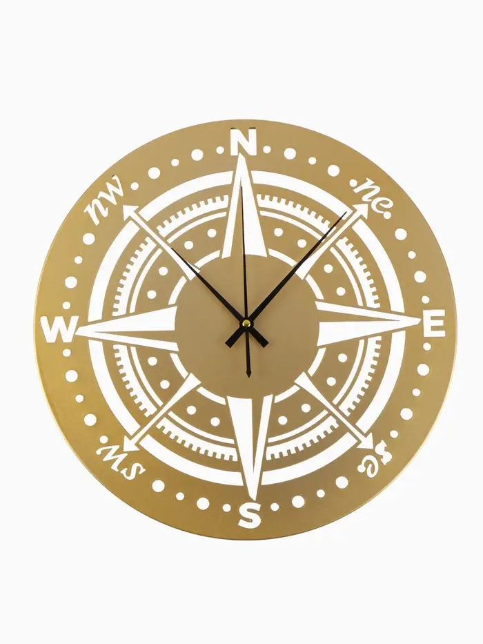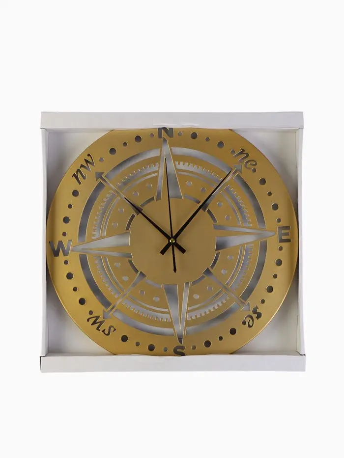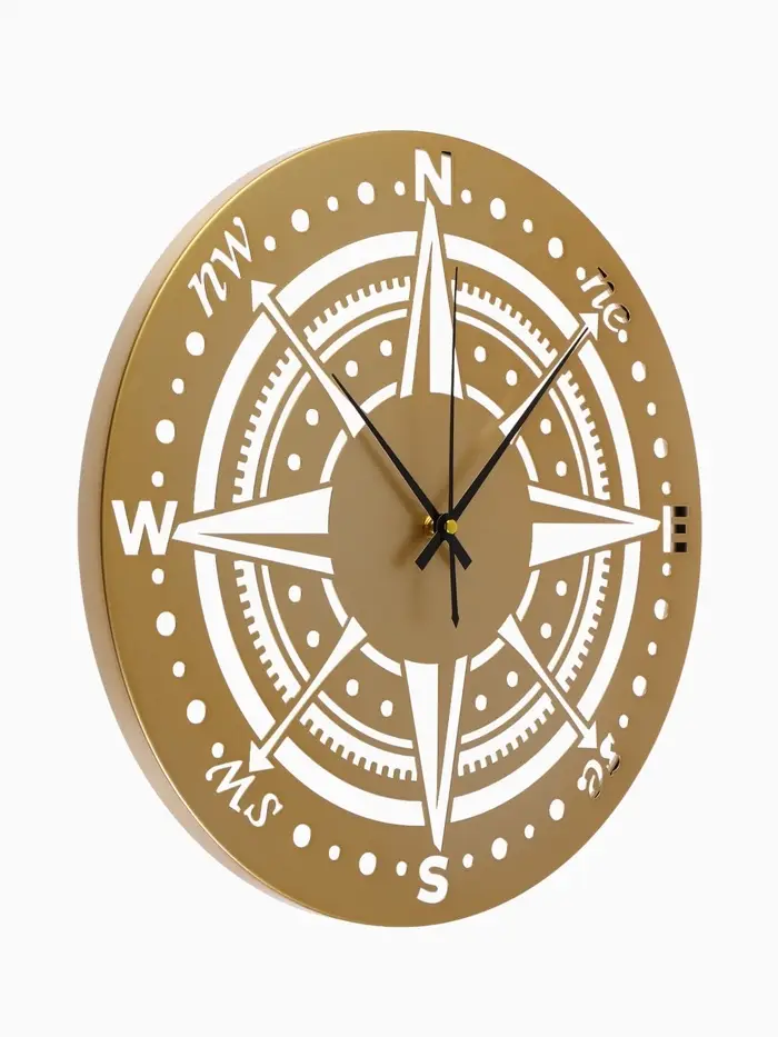 Часы «Компас» с золотистым корпусом подойдут для размещения в гостиной, на рабочем месте или в прихожей. Плавный ход стрелок и чёткие отметки обеспечивают лёгкое ориентирование во времени без лишнего шума.