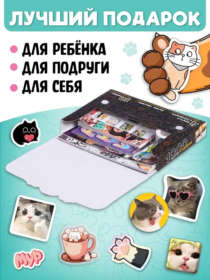 Набор «1000 котостикеров» — это настоящий праздник для любителей творчества и фанатов забавных котиков! Он станет отличным подарком для ребёнка или увлечённого взрослого, ведь в нём собрано всё, чтобы раскрыть творческий потенциал и повеселиться.