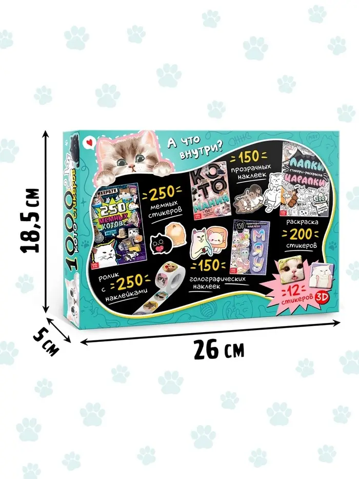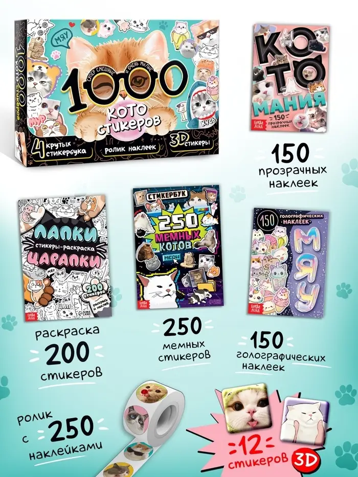 Набор «1000 котостикеров»: 4 стикербука, ролик, 3д стикеры