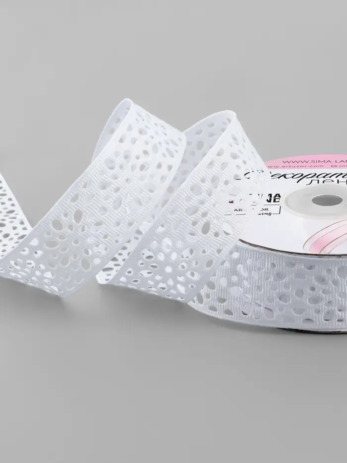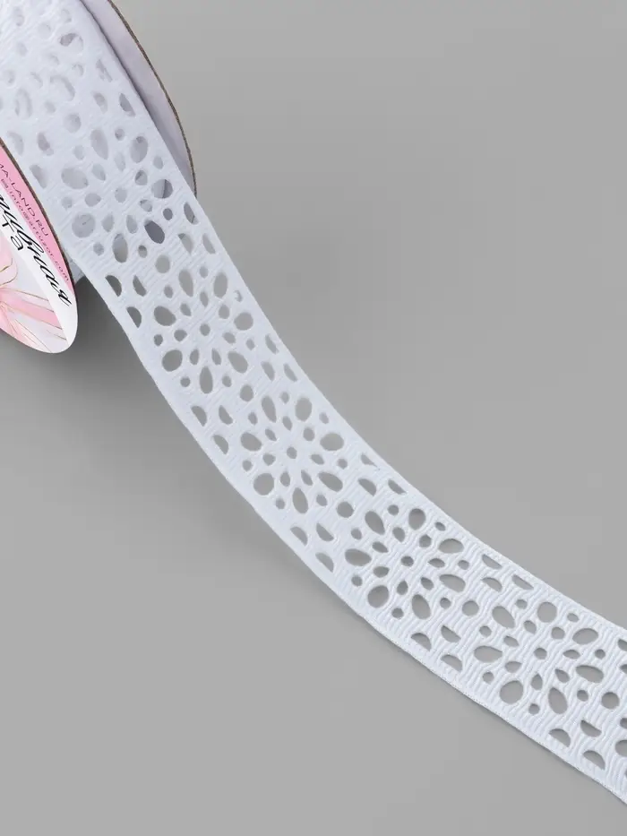 Белая ажурная лента с репсовой основой объединяет структурность и воздушность. Её перфорированный узор создаёт эффект лёгкого кружева, подходя для проектов, где важны чистота линий и деликатность. Длина более 9 метров открывает возможности для разнообразного оформления.