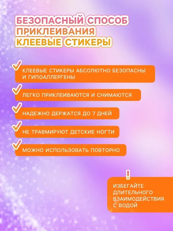 Разнообразие дизайнов поражает воображение: от милых зверушек и сказочных принцесс до ярких цветов и блесток. Каждый набор станет маленьким шедевром на пальчиках вашей девочки, добавляя нотки волшебства в повседневность.