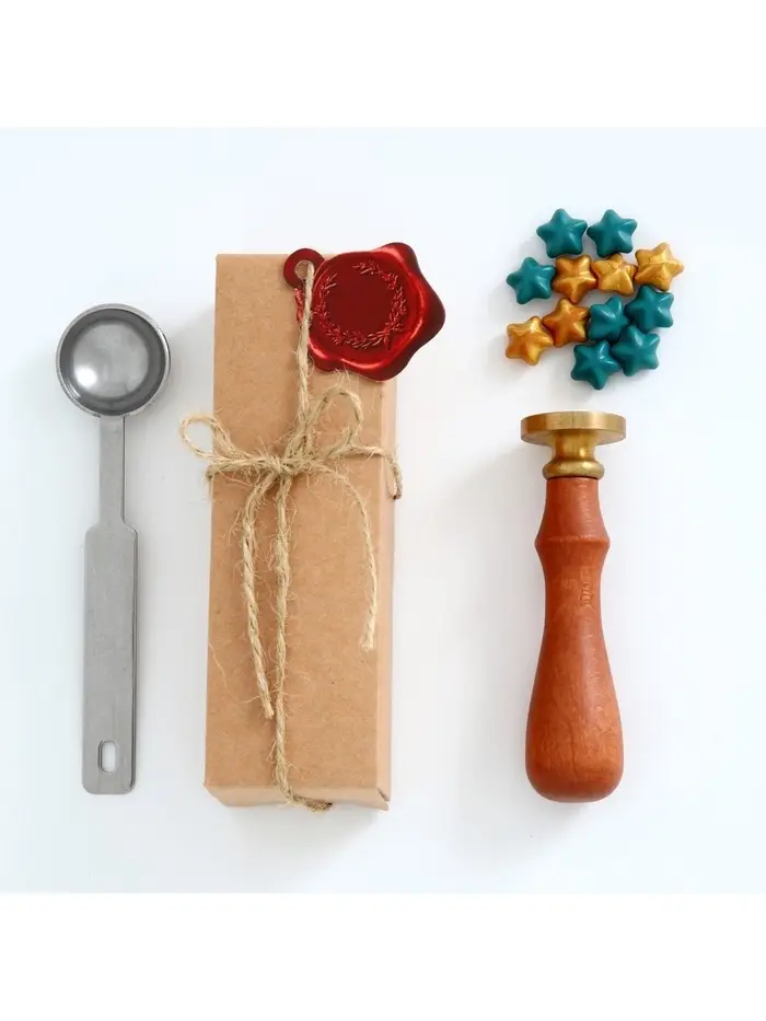Состав набора: Ложка для плавления сургуча Сургуч в гранулах Штамп с деревянной ручкой