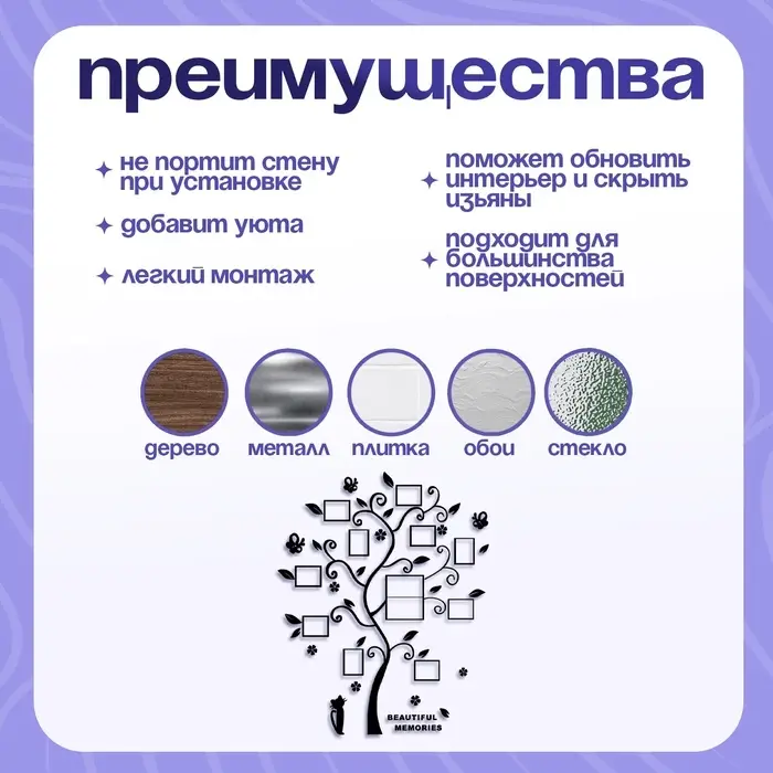 Наклейка интерьерная с фоторамками TAKE IT EASY «Семейное дерево», декор на стену, панно 110×140 см