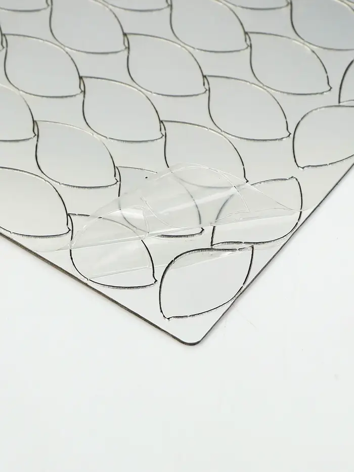 - Наклейка состоит их трёх слоев — виниловой основы с клеевым слоем, защитной подложки снизу и прозрачной плёнки сверху. Не снимайте защитную плёнку с глянцевой части изделия, пока не закончите работы.