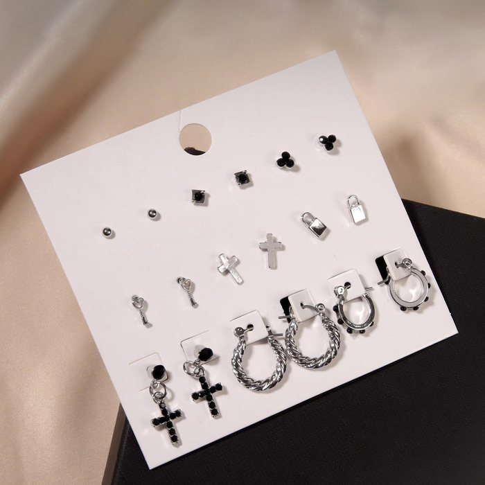 Серьги набор 9 пар «Крестики» кольца, цвет чёрный в серебре