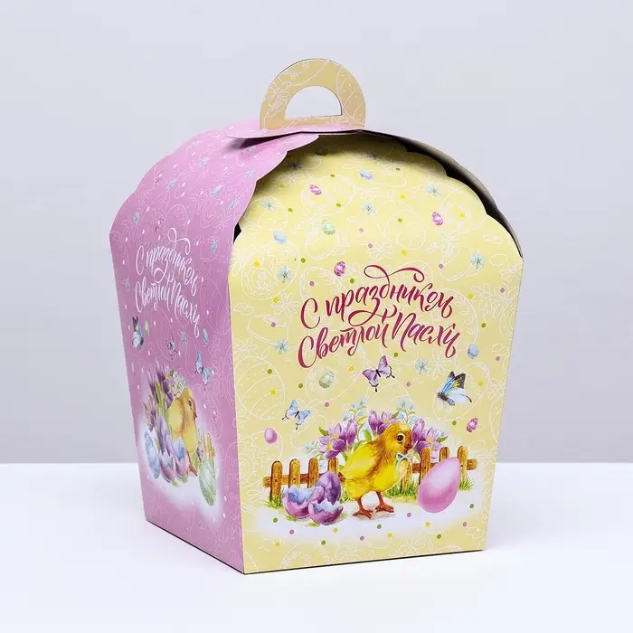 Упаковка, которую запоминают: Эта коробка превращает вручение кулича в маленькое событие. Дети узнают персонажа, взрослые ценят нестандартный подход к оформлению. После извлечения выпечки коробку можно использовать как органайзер или основу для поделки. В отличие от стандартных крафтовых боксов, дизайн с цыплёнком работает как самостоятельный подарок, даже без содержимого. Вы получаете эмоциональную упаковку, которая создаёт праздник одним своим видом.