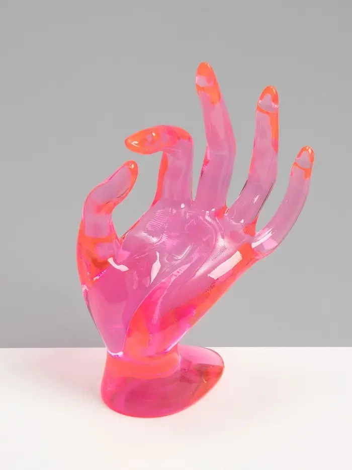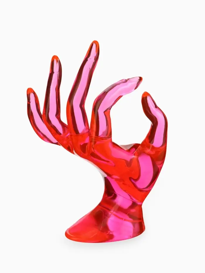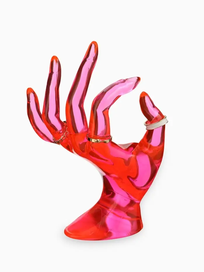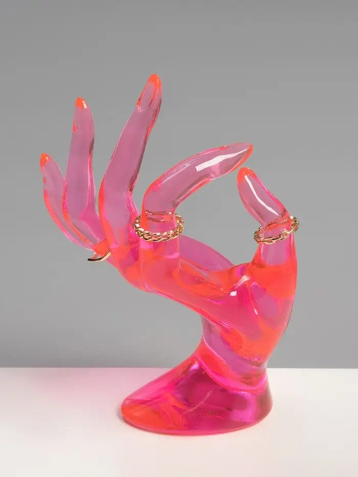 Эта изящная подставка в форме изящной кисти руки превращает хранение аксессуаров в настоящий арт-объект. Нежный розовый оттенок и необычный дизайн делают её не только практичным органайзером, но и стильным акцентом, который освежит ваш туалетный столик или витрину.