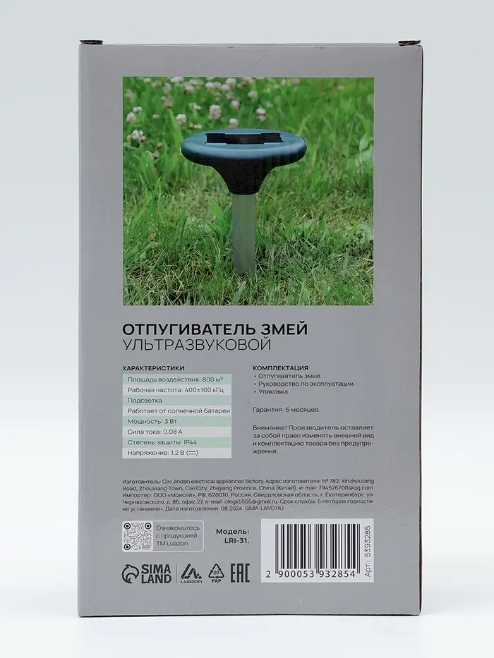 Отпугиватель змей LuazON LRI-31 издаёт высокоинтенсивные звуковые волны, которые находятся за пределами слышимости человека и большинства домашних животных. Площадь воздействия: 800 квадратных метров. Работает от солнечной батареи.