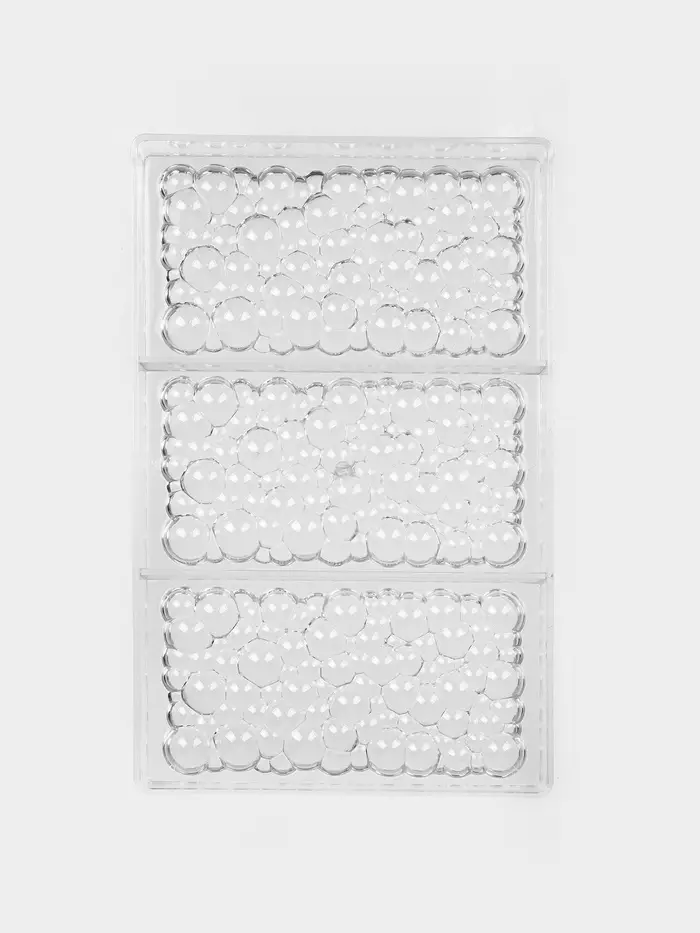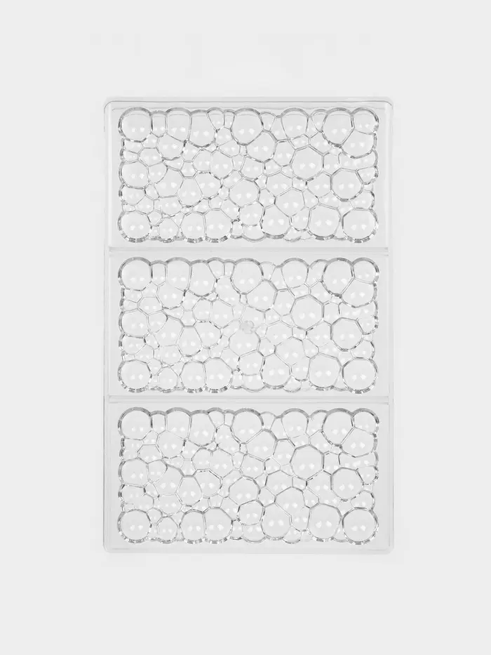 Форма «Воздушный» — лаконичный выбор для тех, кто ценит крупные, гладкие плитки шоколада без лишних деталей. Три вместительные ячейки позволяют отлить за один раз три цельные плитки с ровной поверхностью — идеально для чистого вкуса, минималистичной подачи или экспериментов с начинками: орехами, семенами, цукатами или морской солью.