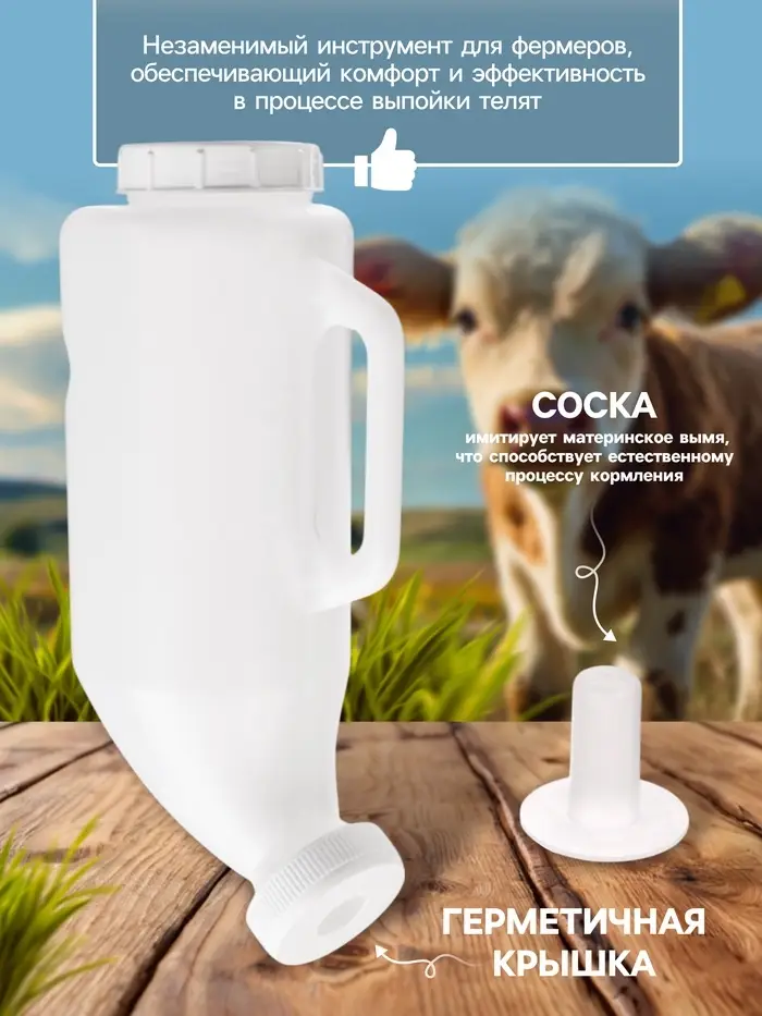 Практичная бутыль для выпойки объёмом 2 л станет незаменимым помощником в уходе за телятами. Компактная конструкция с удобной ручкой облегчает процесс кормления и обеспечивает гигиеничность использования.