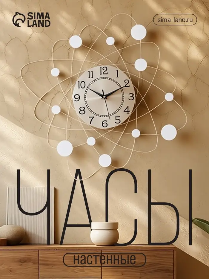 Часы настенные — функциональный элемент декора, который будет уместно смотреться в квартирах, офисах, приемных, вестибюлях, залах ожидания. Они станут отличным подарком на любой праздник.