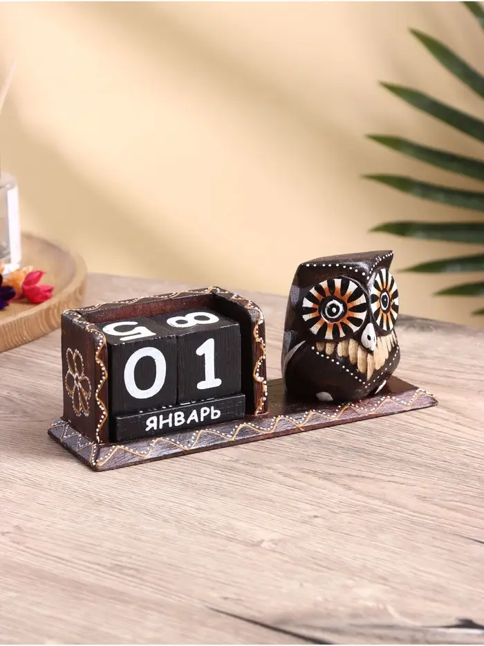 Гармония на столе: Календарь «Сова» организует не только даты, но и пространство вокруг себя. Его теплая коричневая гамма и природные формы вносят баланс в современный интерьер. Это больше, чем инструмент — это точка притяжения, которая дисциплинирует взгляд и мысли. Подарите себе или коллеге вечный источник порядка и вдохновения, созданный из дерева.