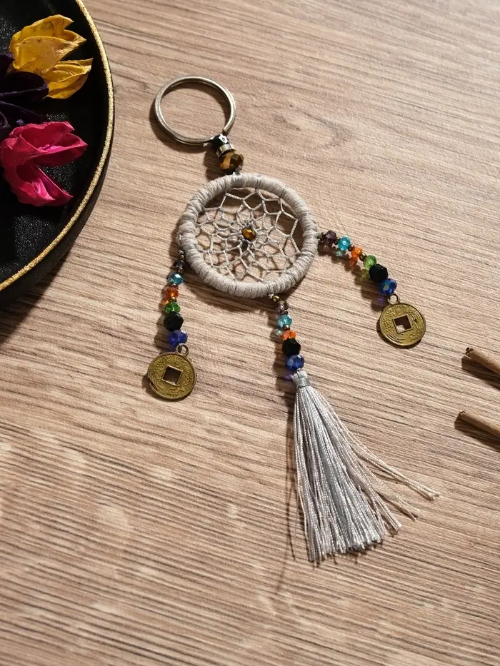 Этот аксессуар не только украшает, но и несёт в себе глубокий смысл. Ловец снов традиционно считается оберегом, который защищает от плохих снов и негативной энергии. Брелок в таком стиле станет приятным напоминанием о заботе и внимании, а его нейтральный бежевый цвет подойдёт для тех, кто ценит сдержанность и элегантность.