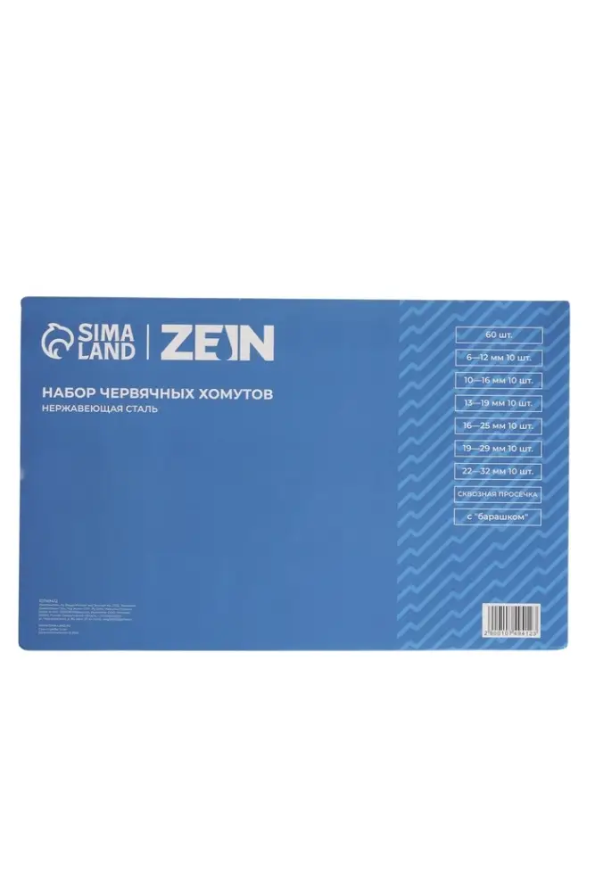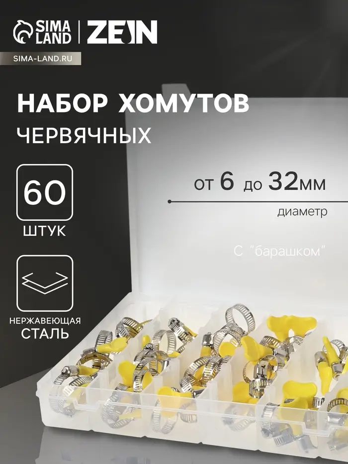 Набор червячных хомутов с «барашком» ZEIN engr, сквозная просечка, от 6 до 32 мм, 60 шт.