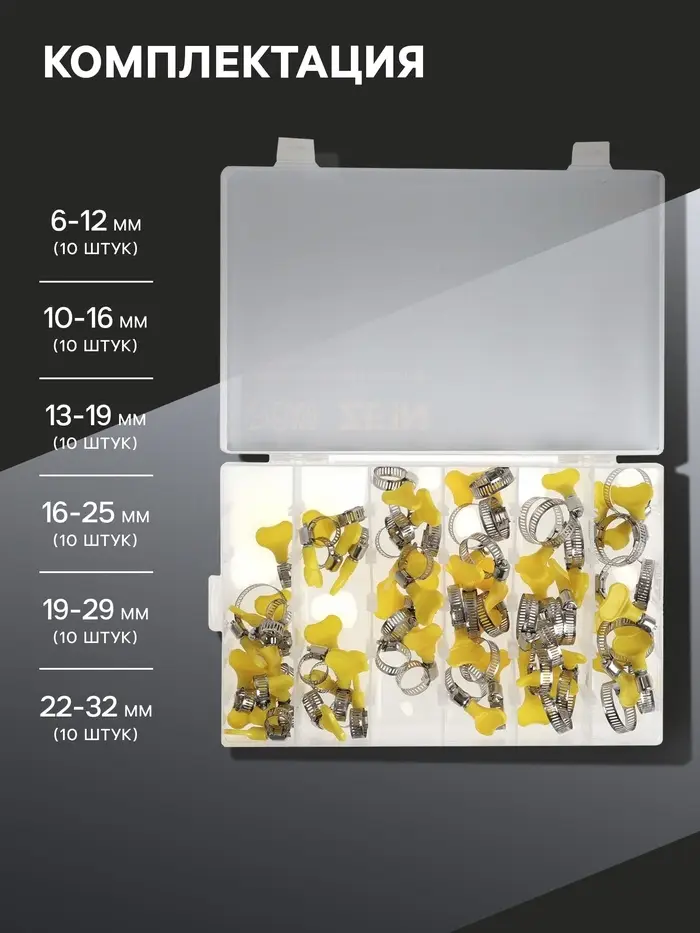 Набор червячных хомутов с барашком 6-32 мм — комплект для быстрого крепления шлангов и патрубков. Затяжка выполняется без инструментов.
