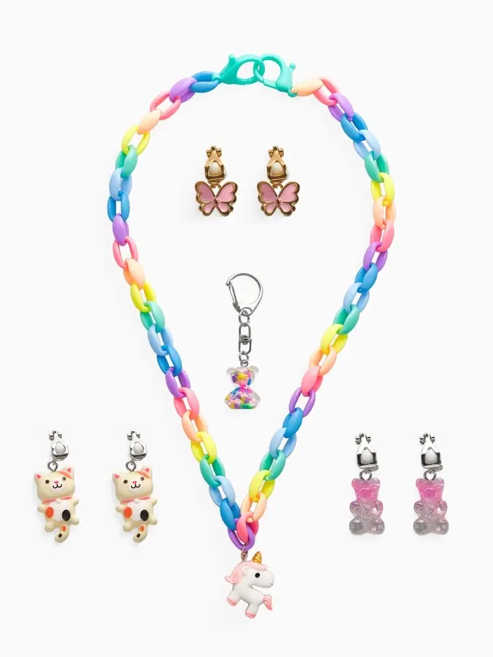 Подарите своей маленькой моднице невероятное удовольствие с этим ярким набором, который включает в себя цепочку с единорогом, три пары клипс и милый брелок в виде мишки! Этот набор станет настоящим сокровищем для каждой девочки, позволяя ей выразить свою индивидуальность и добавить волшебства в каждодневные образы.