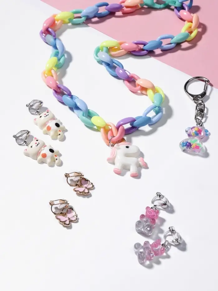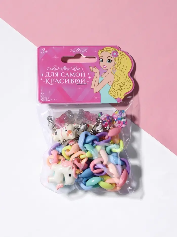 Изготовленный из безопасного пластика, этот набор сочетает в себе яркие цвета и разнообразные элементы, которые легко комбинируются друг с другом. Цепочка с единорогом станет изюминкой любого наряда, а клипсы и брелок добавят игривости и стиля. Идеально подходит для праздников, таких как выпускной в детском саду или День защиты детей, а также для веселых встреч с подружками.