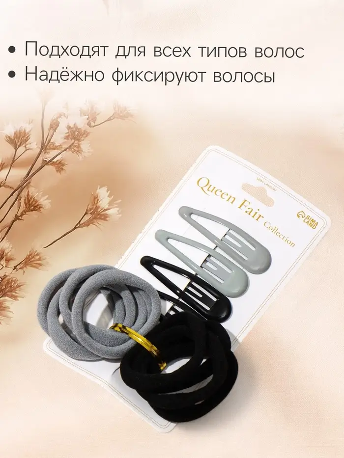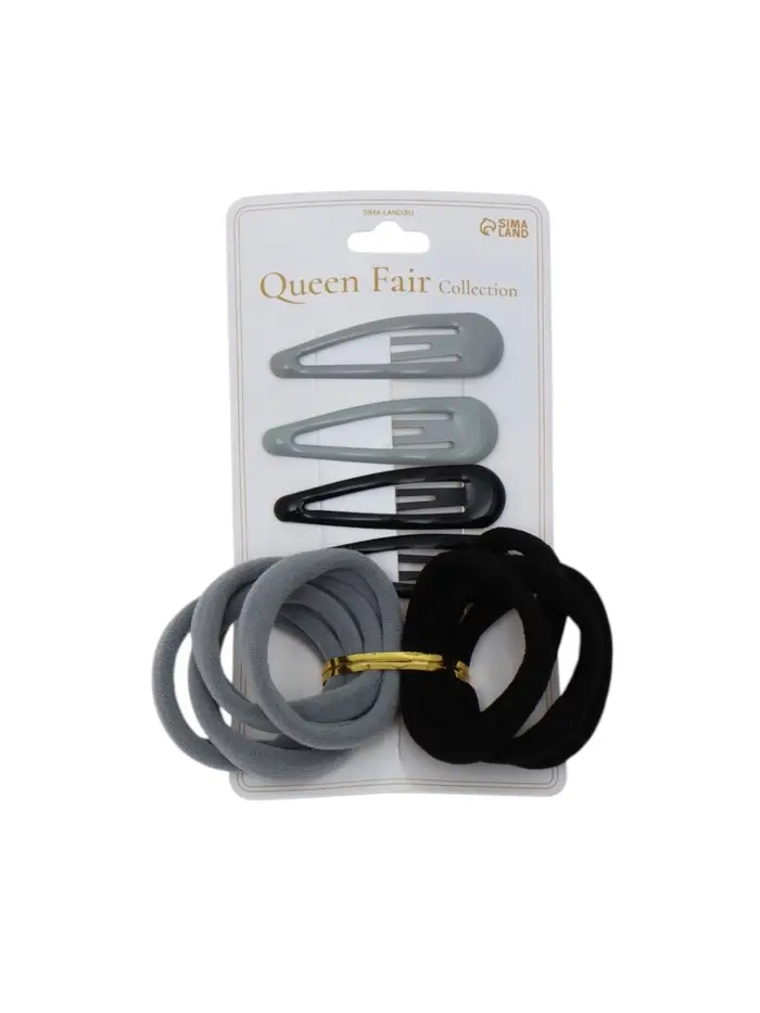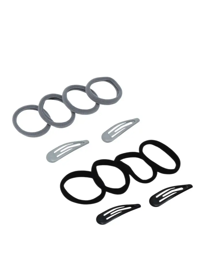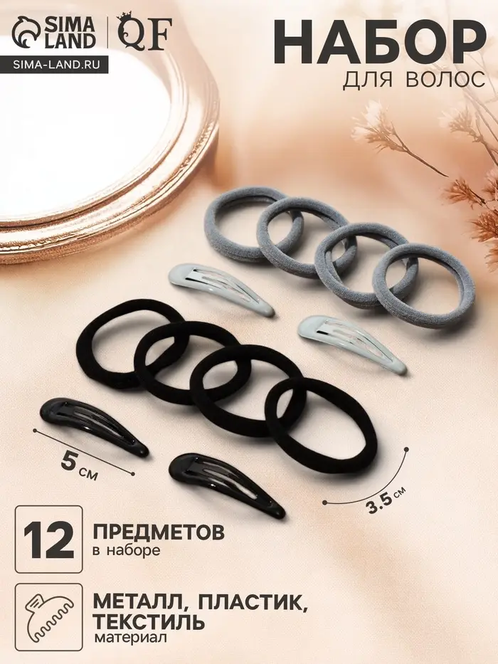 Набор для волос QF «Мира», 12 шт.: 4 заколки 5 см, 8 резинок 3.5 см, серо-чёрный
