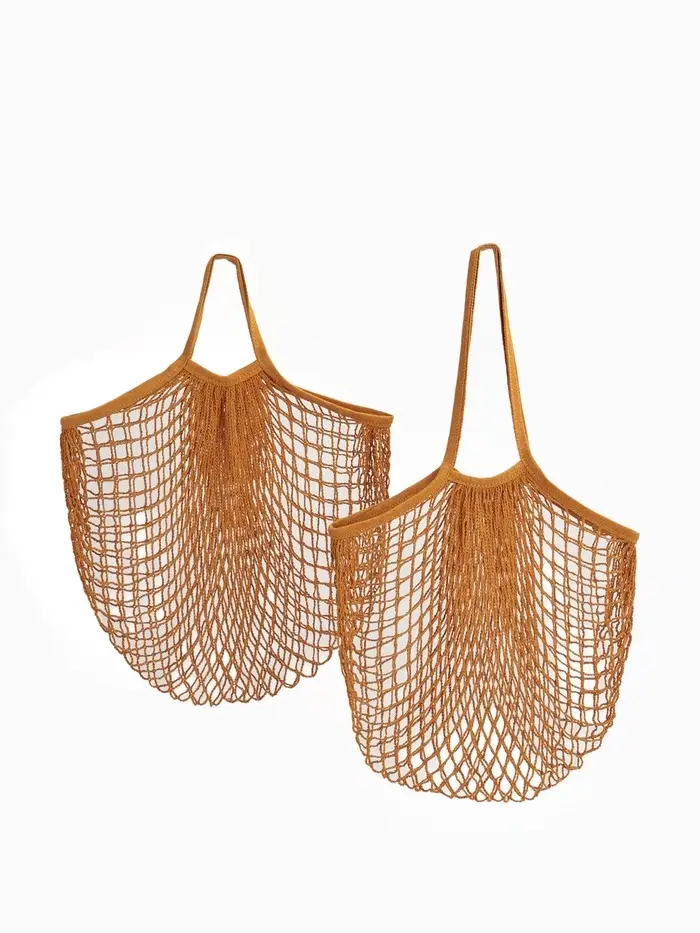 Этот набор из двух больших рыжих авосек — ваш верный помощник для повседневных забот. Плетёная из натурального хлопка, такая сумка дышит, легко складывается и всегда готова к спонтанному походу на рынок или в магазин. Она выдерживает вес покупок до 3,5 кг.