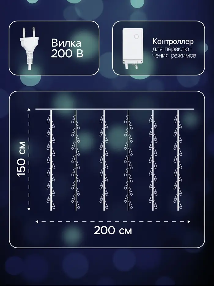 Гирлянда «Водопад» 2×1.5 м, IP20, прозрачная нить, 400 LED, свечение белое, 8 режимов, 220 В