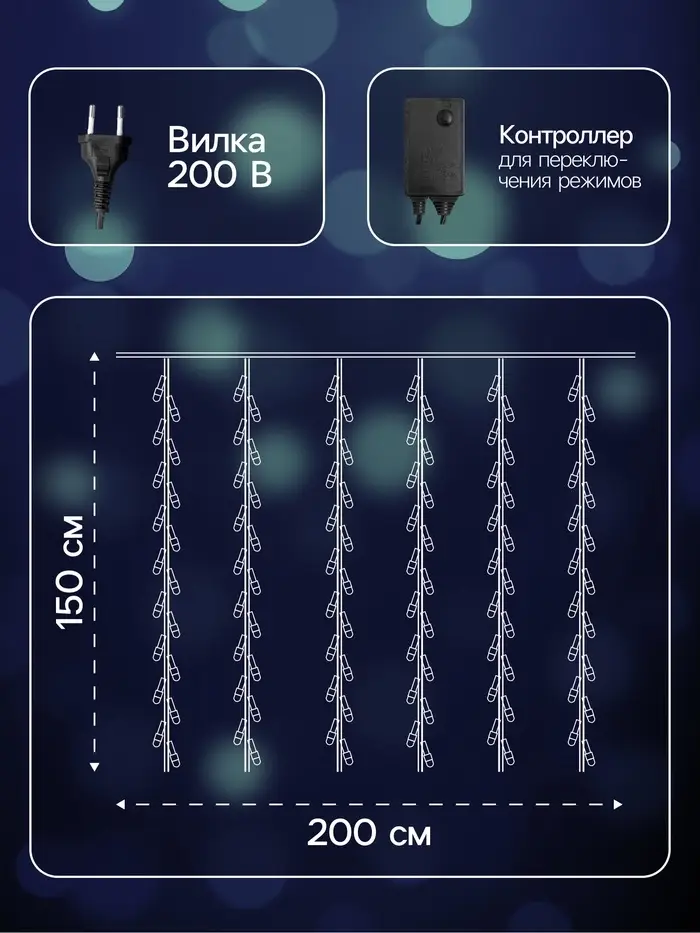 Гирлянда «Бахрома» 3×0.6 м, IP44, УМС, тёмная нить, 160 LED, свечение бело-синее, мигание, 220 В