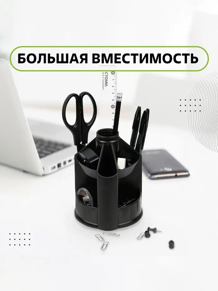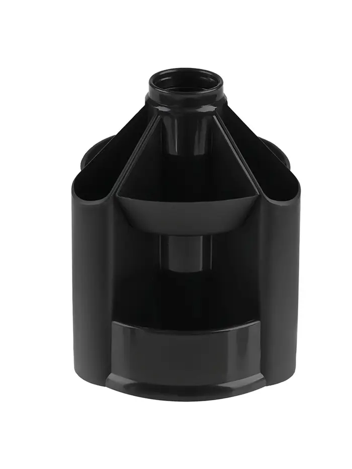 Настольная подставка серии "Mini Desk" предназначена для хранения канцелярских принадлежностей. Вместительная и устойчивая подставка имеет 10 отделений разной высоты и формы. Изделие высотой 14,0 см и основанием 10,5 х 10,5 см изготовлено из качественного пластика. Свободно вращается на 360 градусов. Поставляется без наполнения. Цвет изделия - черный