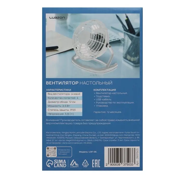 Вентилятор настольный Luazon LOF-06, осевой, 2.5 Вт, 12 см, пластик, белый