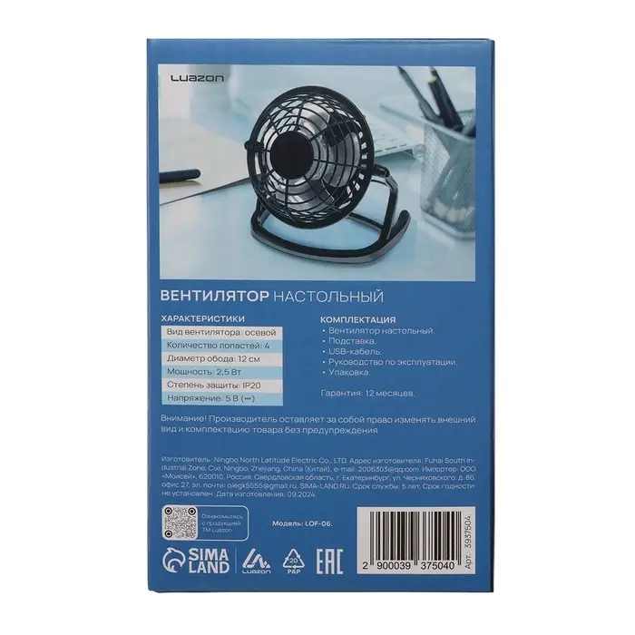 Вентилятор настольный Luazon LOF-06, осевой, 2.5 Вт, 12 см, пластик, чёрный