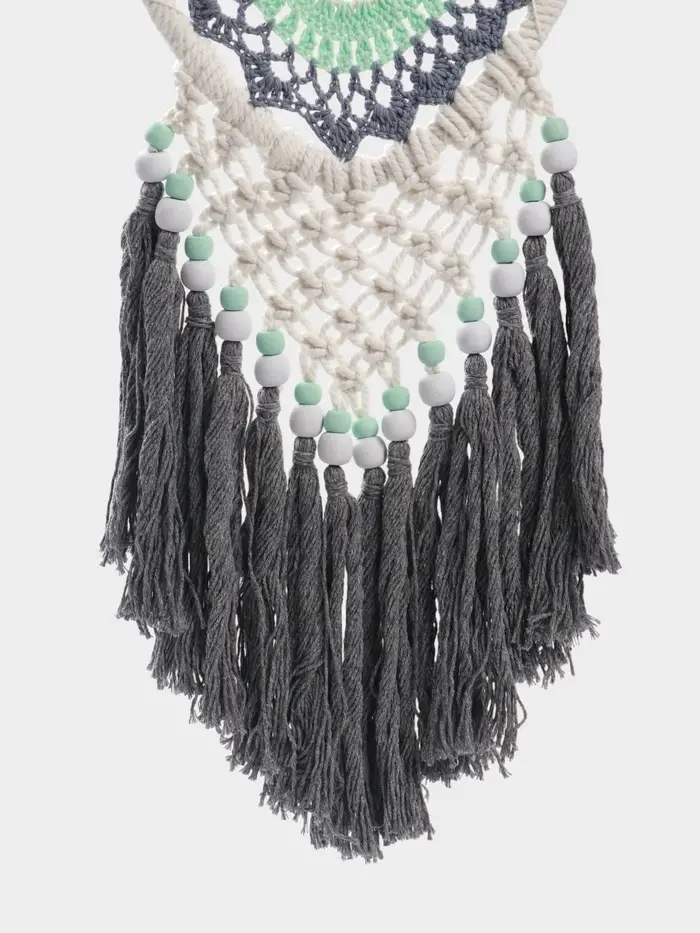 - Натуральные и прочные материалы: В основе — деревянный обруч, оплетённый плотным текстилем. Паутина из прочных нитей надёжно удерживает бусины из пластика и дерева. Каждый материал выбран для долговечности и тактильной приятности.