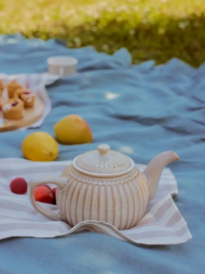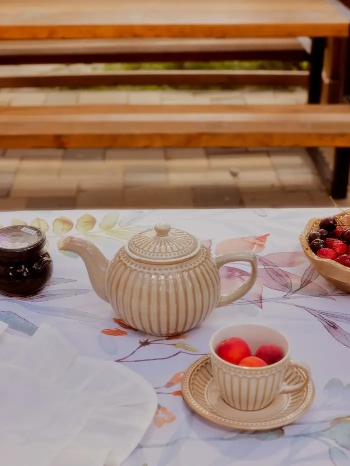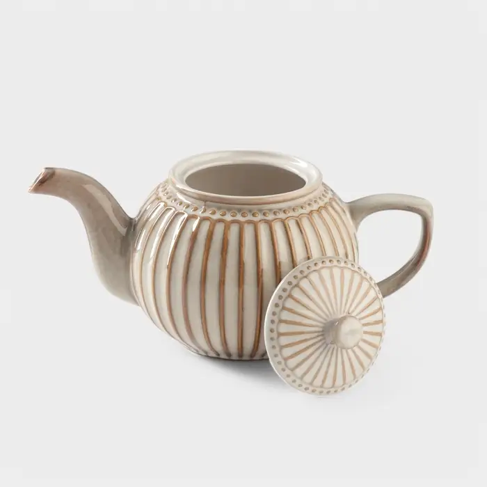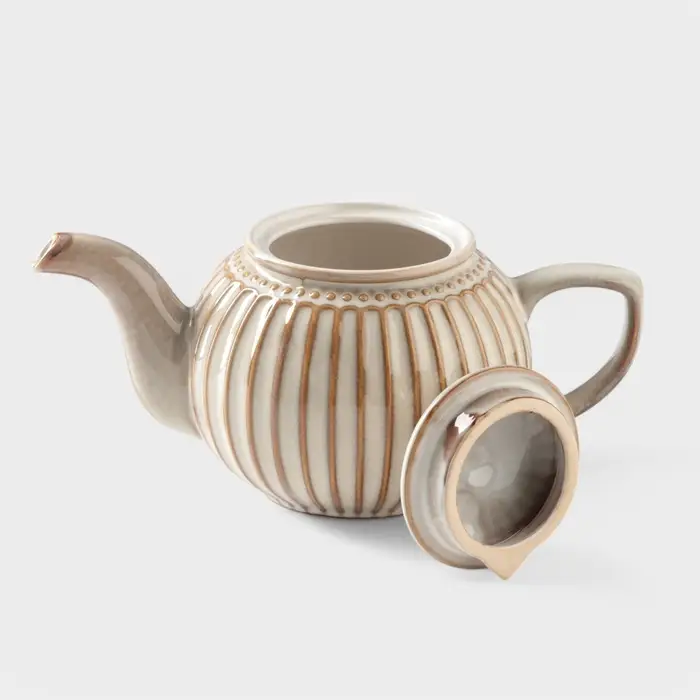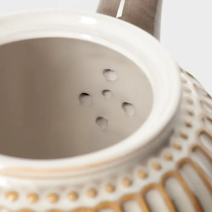 Изготовленный из качественной керамики, этот чайник отличается прочностью и долговечностью. Бежевый цвет и рельефная текстура придают ему особый шарм, а наличие фильтра делает процесс заваривания удобным и эффективным. Чайник оснащён керамической крышкой, что сохраняет тепло и аромат чая.