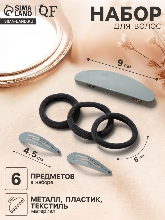 Набор для волос QF «Авиталь», 3 резинки 6 см, заколка - автомат 9 см, 2 заколки 4.5 см, серый