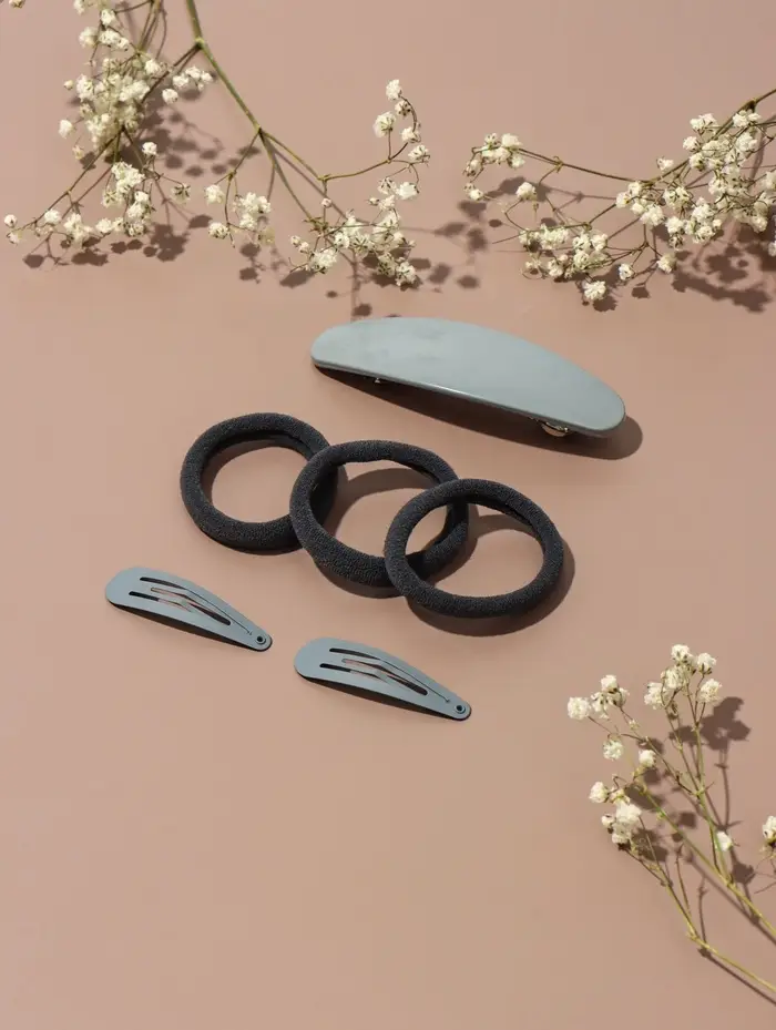 - Полный набор на каждый день: В комплекте вы найдете три текстильные резинки, автоматическую заколку и две заколки "клик-клак". Такого набора достаточно для создания множества укладок — от строгого пучка до небрежного хвоста или элегантной прически с фиксацией отдельных прядей.