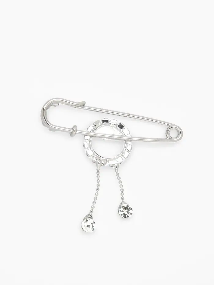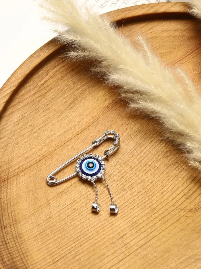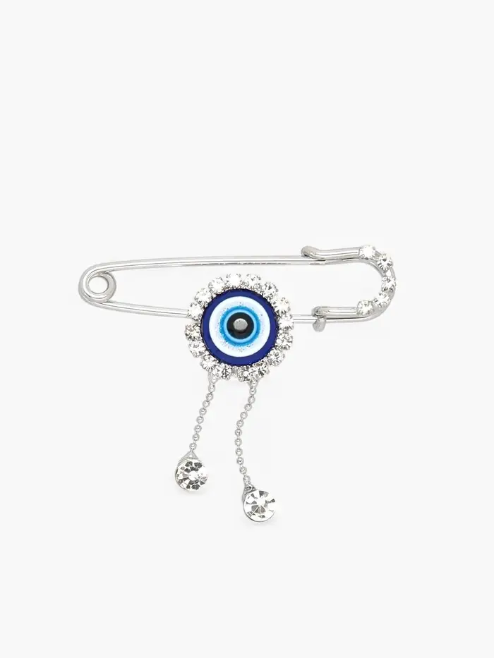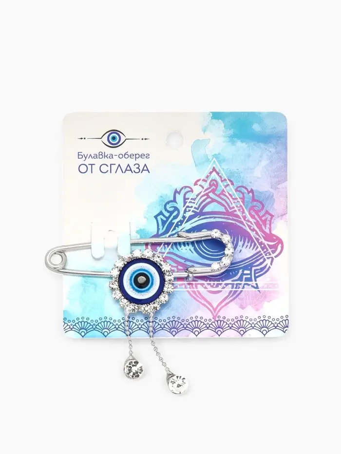 Эта изящная булавка-оберег сочетает в себе глубокий символизм и утончённый дизайн. Длина 5 см, выполненная из прочного металла с серебристой фурнитурой, она украшена стеклянной вставкой в виде глаза с подвесками, которые нежно переливаются бело-синими оттенками. Такой аксессуар станет не только стильным дополнением к образу, но и надёжной защитой от негативных энергий.