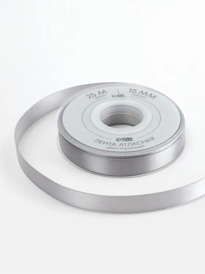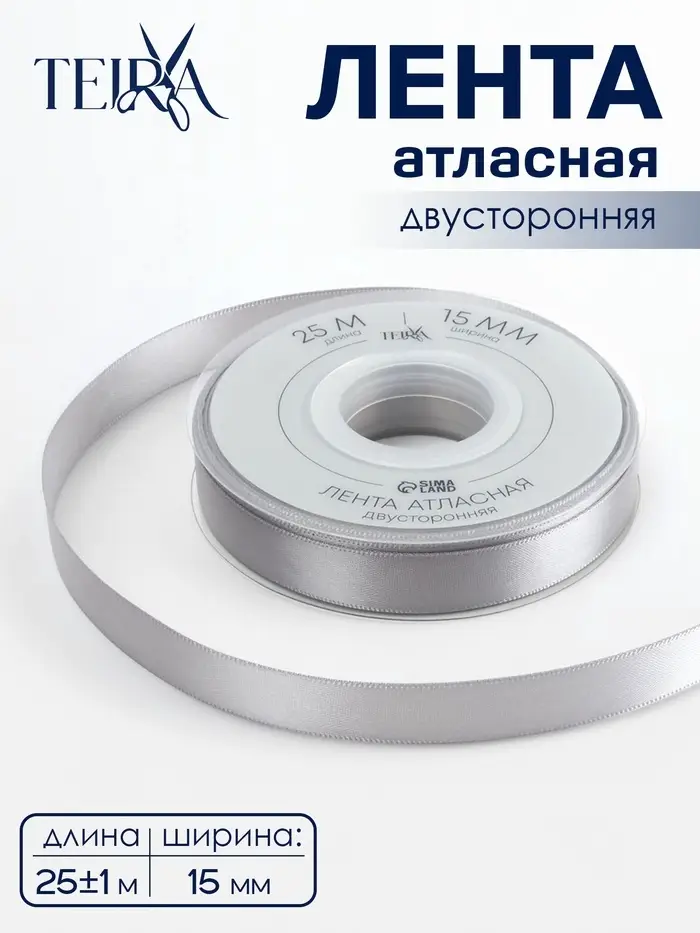 Лента атласная TEIRA, двухсторонняя, 15 мм, 25±1 м, цвет серебряный №837