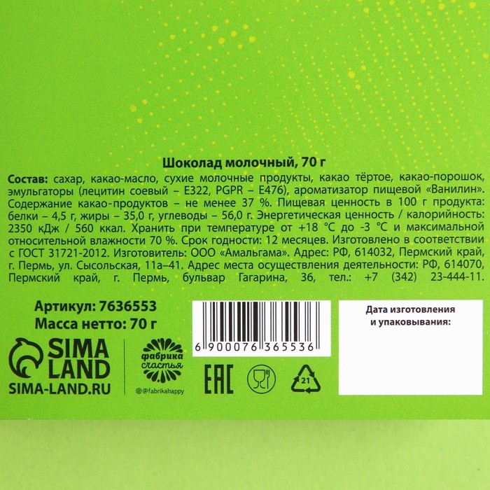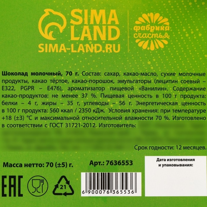 Состав: сахар, какао-масло, сухие молочные продукты, какао тертое, какао-порошок, эмульгаторы (лецитин соевый – Е322, PGPR – Е476), ароматизатор пищевой «Ванилин». Содержание какао продуктов – не менее 37 %.