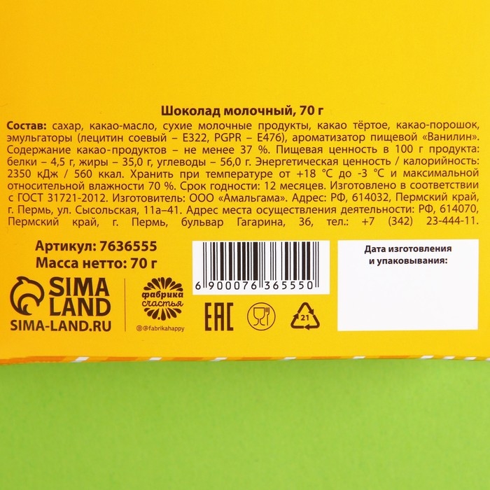 Состав: сахар, какао-масло, сухие молочные продукты, какао тертое, какао-порошок, эмульгаторы (лецитин соевый – Е322, PGPR – Е476), ароматизатор пищевой «Ванилин». Содержание какао продуктов – не менее 37 %.