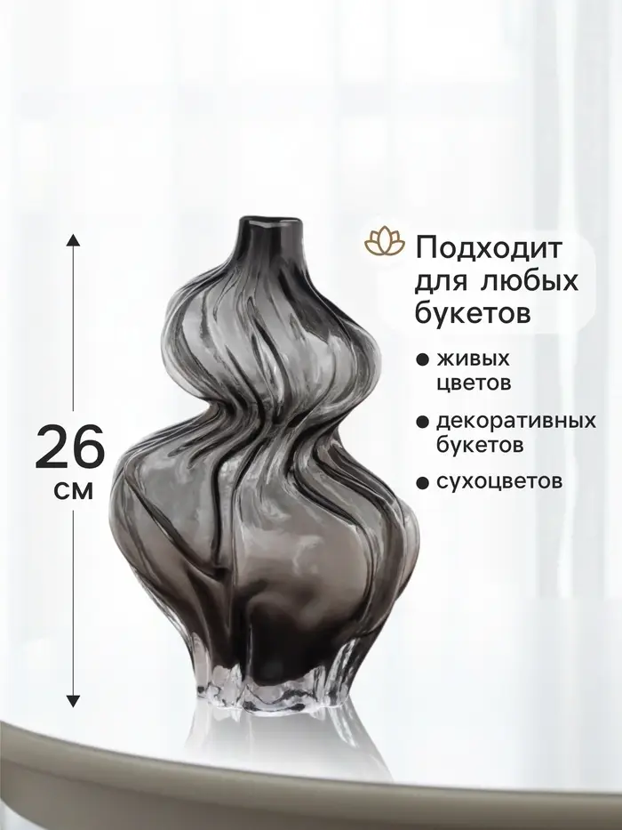 - Высокая и элегантная форма: С высотой 26 см, ваза станет центром внимания на столе или полке, подчеркивая ваш стиль.