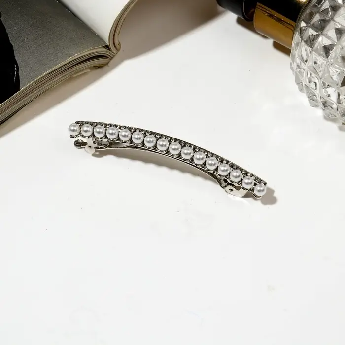 Заколка - автомат для волос «Луиза», жемчуг и стразы, 6.5 см, серебро