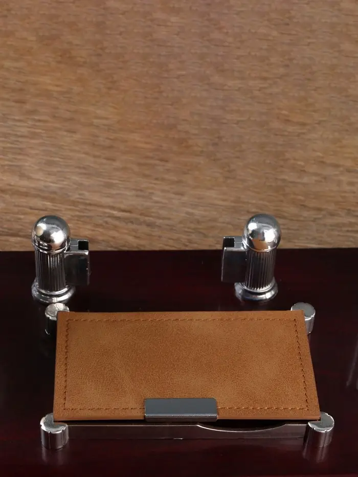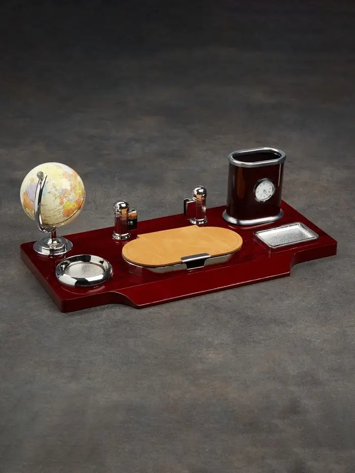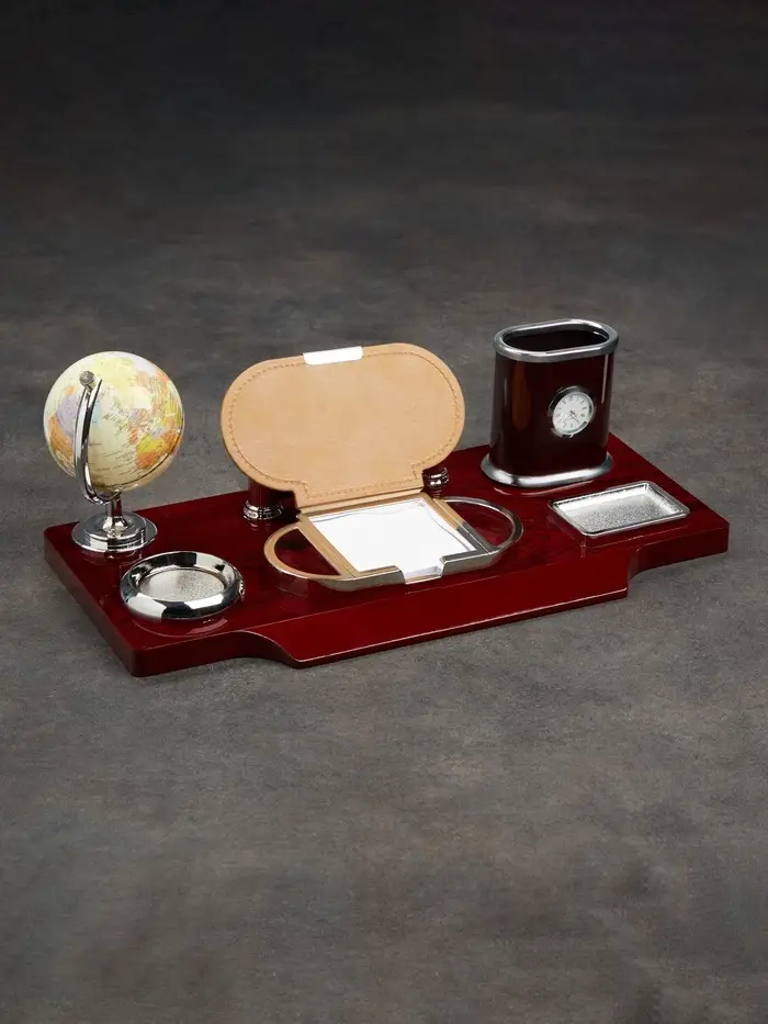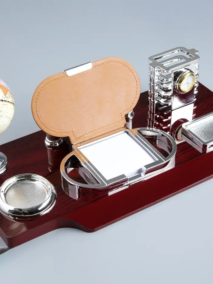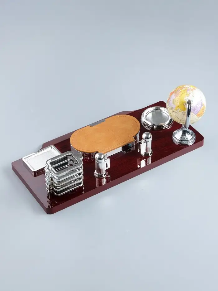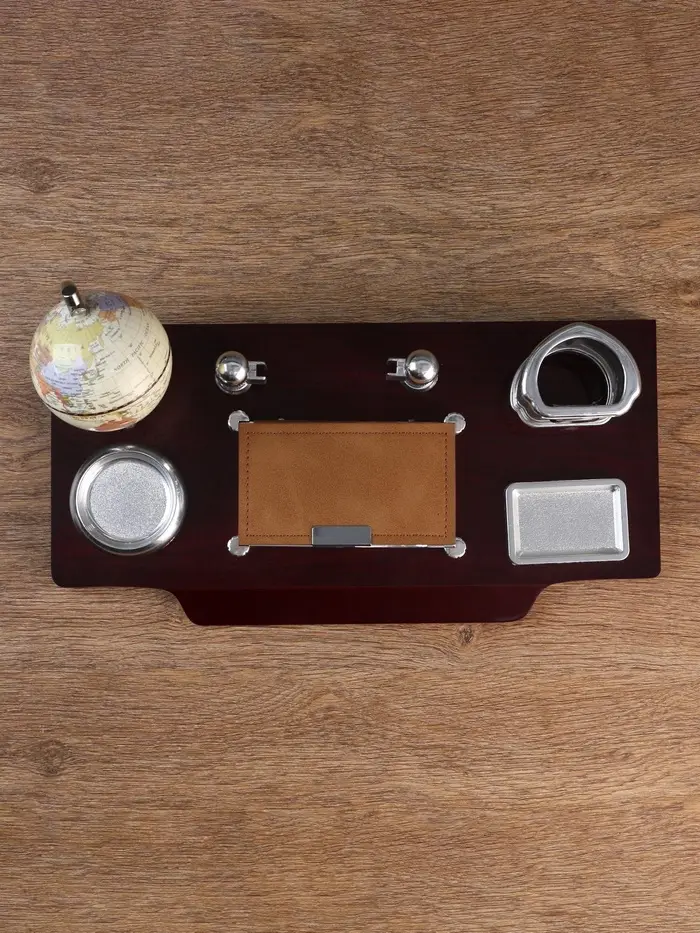 Компактный настольный набор поможет избежать хаоса на рабочем месте. Храните в нём канцелярские принадлежности или другие мелочи, чтобы правильно организовать пространство. К тому же изделие имеет минималистичный дизайн и выполнено под дерево, поэтому оно украсит собой любое место как декоративный элемент.